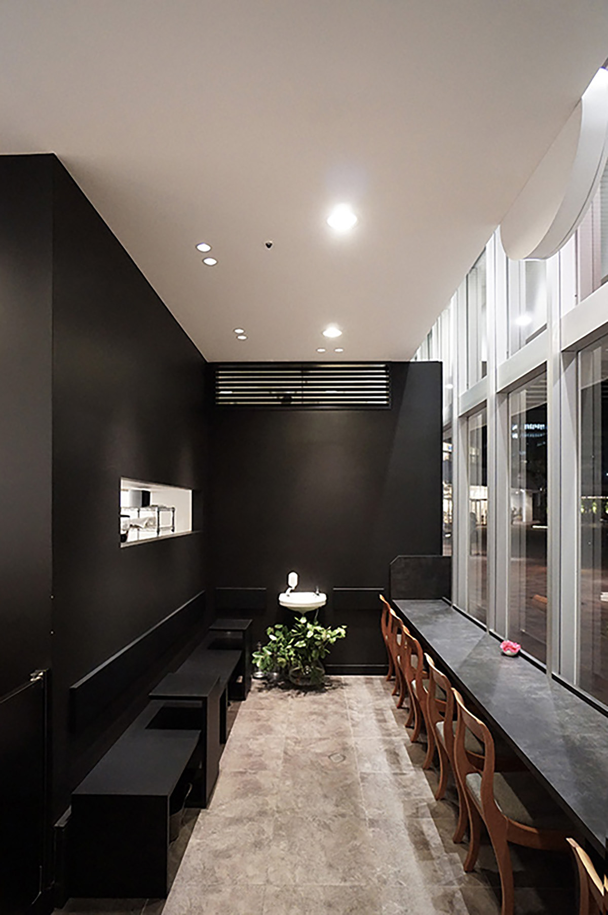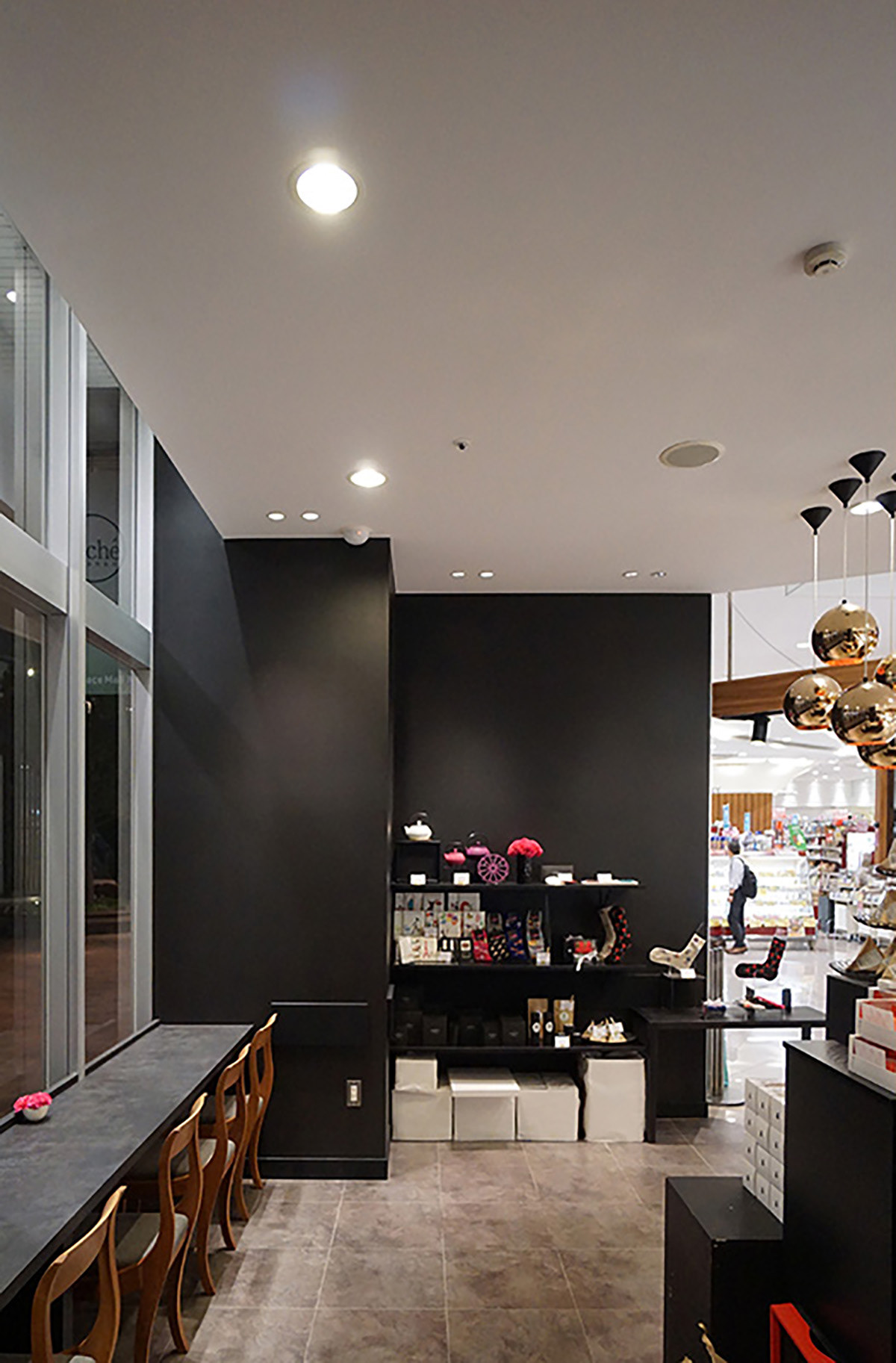 大型ショッピングセンターのリニューアルに伴う新店舗の計画。元の店舗からの居抜きに近い形で、コストを抑えながらも新しさを求められる計画でした。オーナーのご意向もあり、ほぼ黒一色で統一することで、そのインパクトにより、元の店舗の雰囲気を感じさせない店舗ができました。